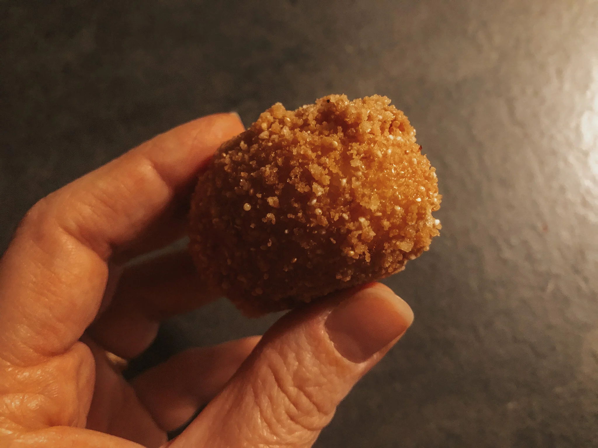 Un esempio sono queste crocchette di baccalà senza glutine: un cuore patate e baccalà mantecato con bevanda vegetale e uno scrigno croccante di farina di riso, acqua, pangrattato e magico amaranto.